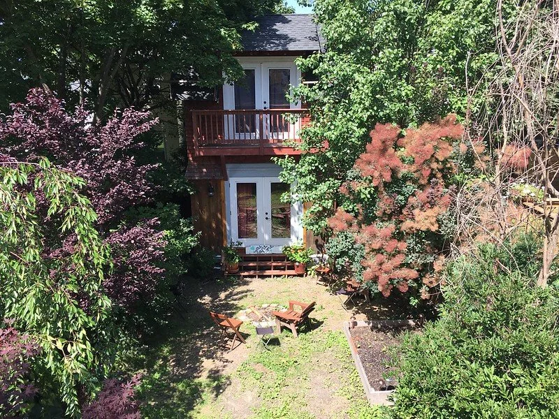New construction (in my backyard), hybrid timber frame, double decker art studio, backyard speakeasy performance space, tiny home, 10-12 footprint, 25ft eave, seasonal plumbing (sink/toilet), electric heaters, mini fridge, ceiling fan, and 50 amp panel. Portland, Maine.